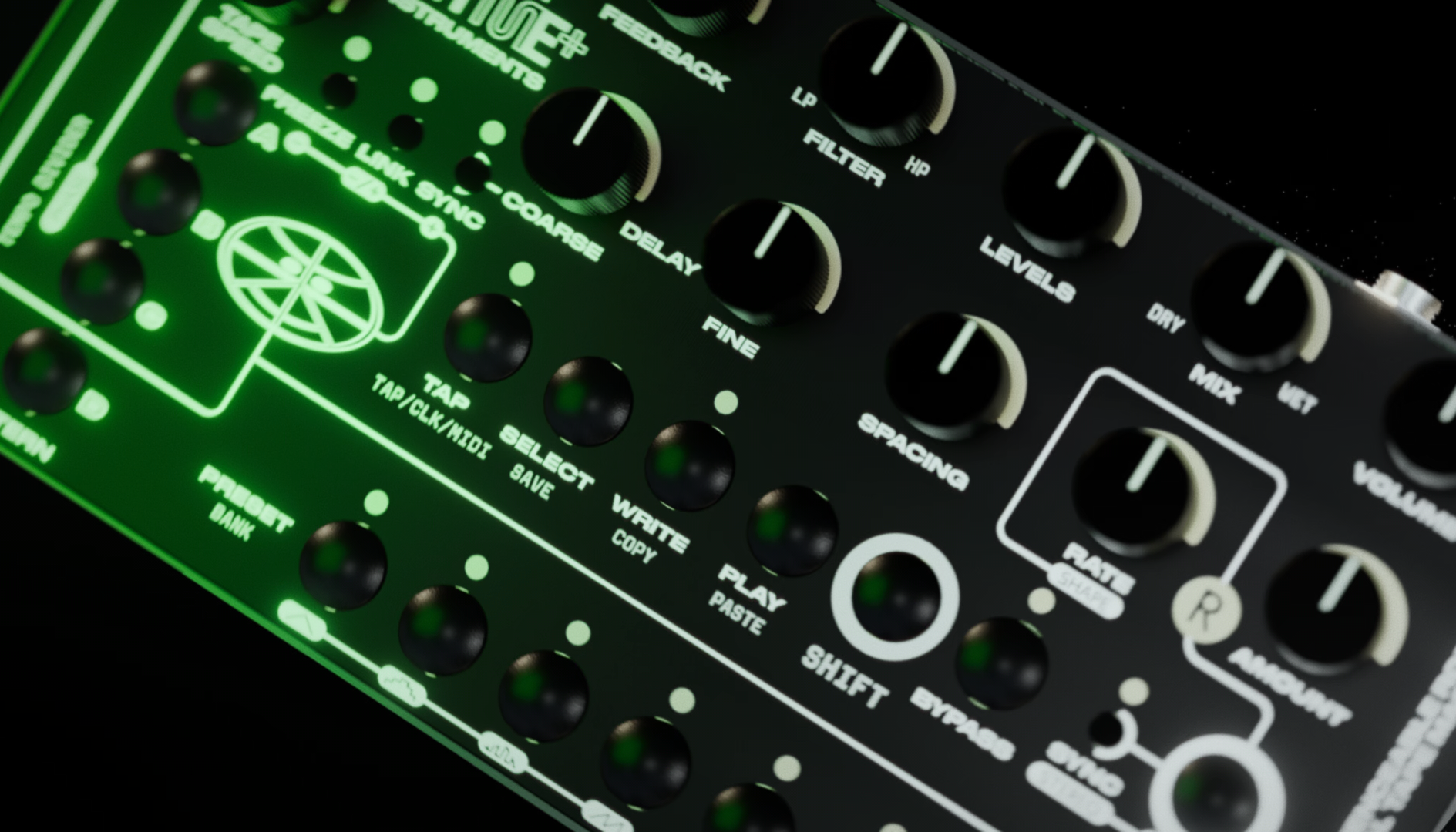 - CV input 0–5V (volt per octave for Tape Speed and Delay Time)